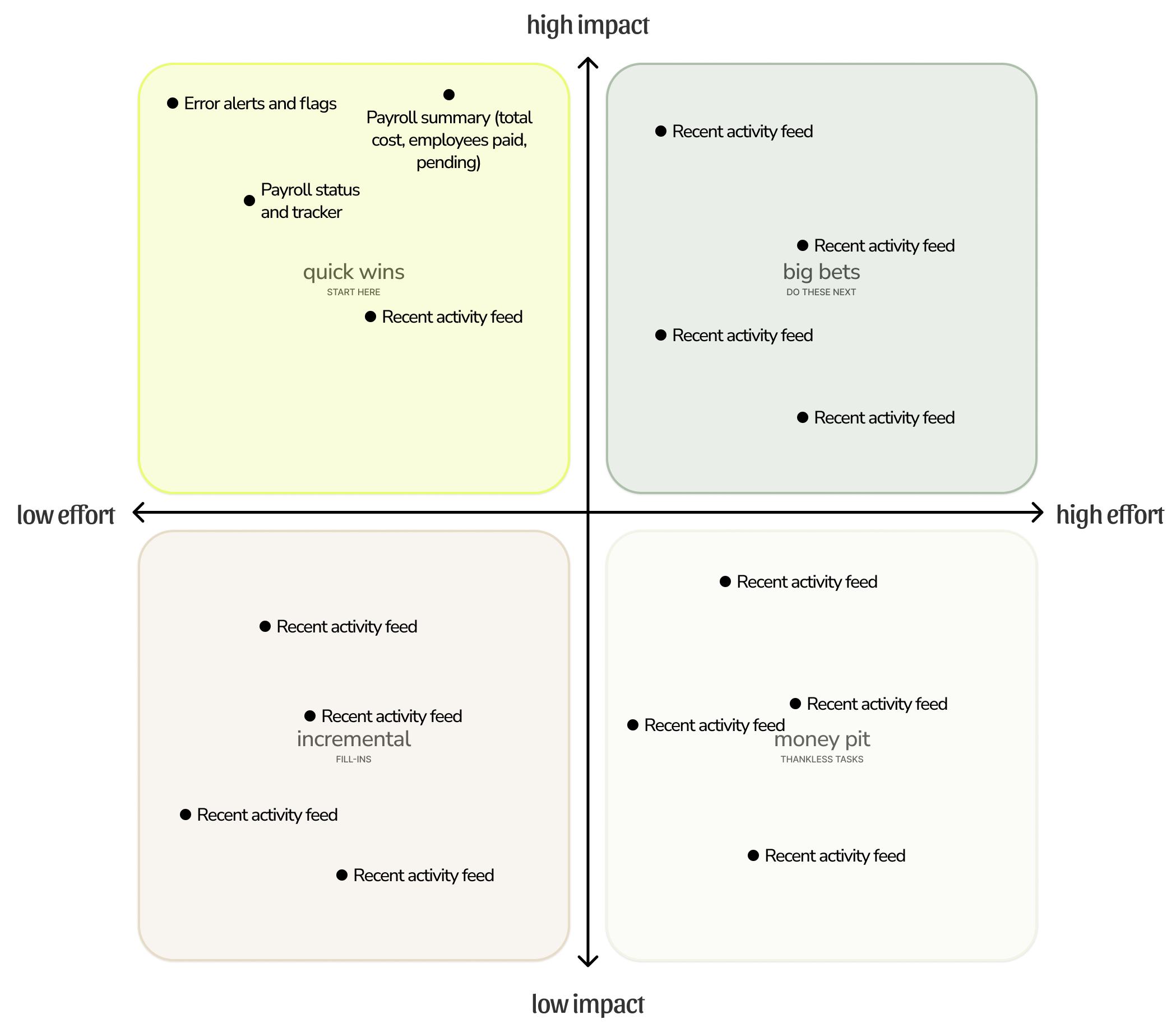 To prioritize features, I used an Impact vs Effort matrix to identify high-value opportunities that could improve payroll efficiency while balancing implementation complexity. This helped focus the design on features that deliver immediate value, such as payroll summaries, status tracking, and error alerts.